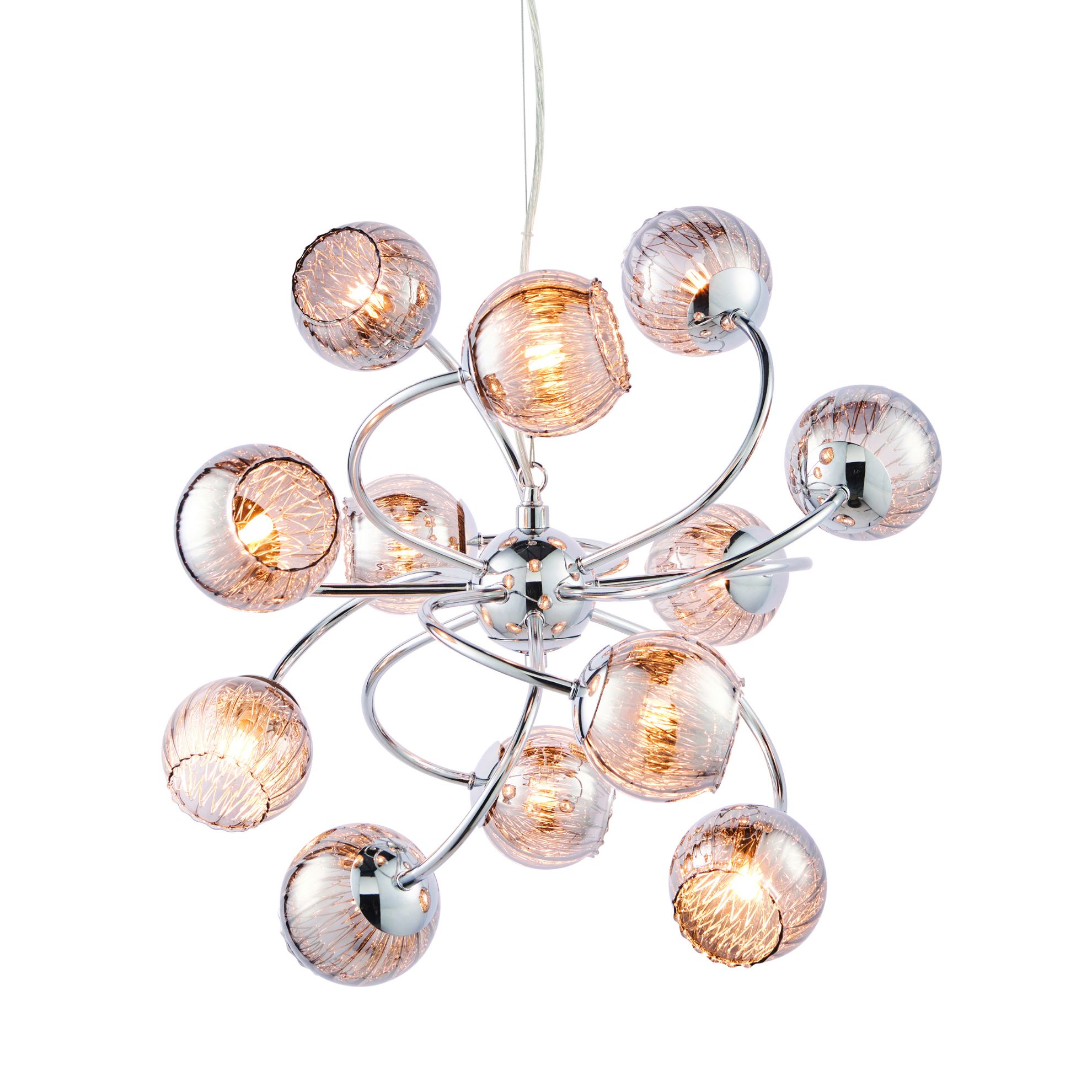 The impressive Aerith pendant light is finished in a shiny chrome effect plate, with smokey mirror effect glass which houses wire mesh to create a stunning light effect.