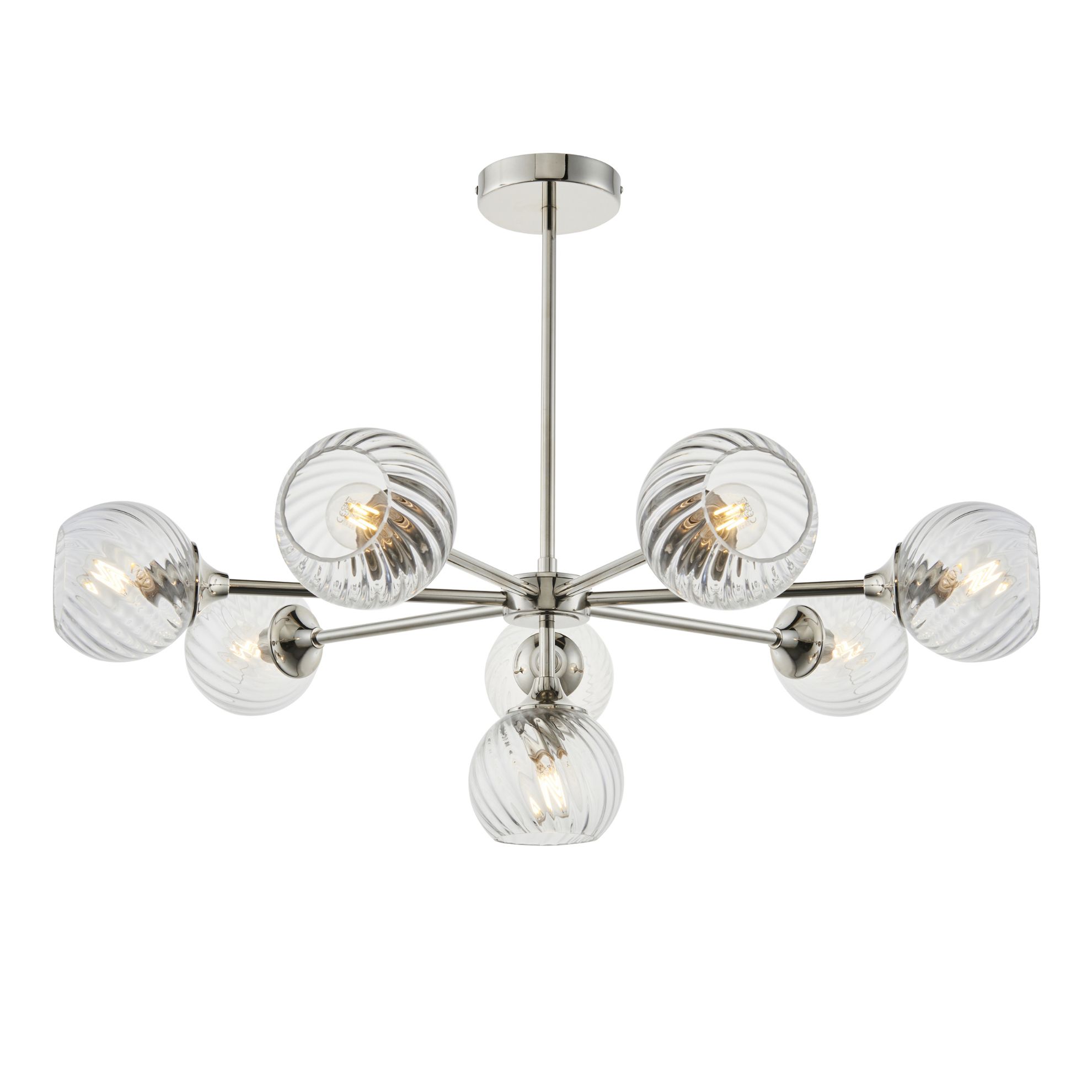 Twisted glass shades give this ceiling light a decorative edge. This 8 light semi flush is perfect for casting light around rooms with low ceilings, finished in a stunning bright nickel plate.