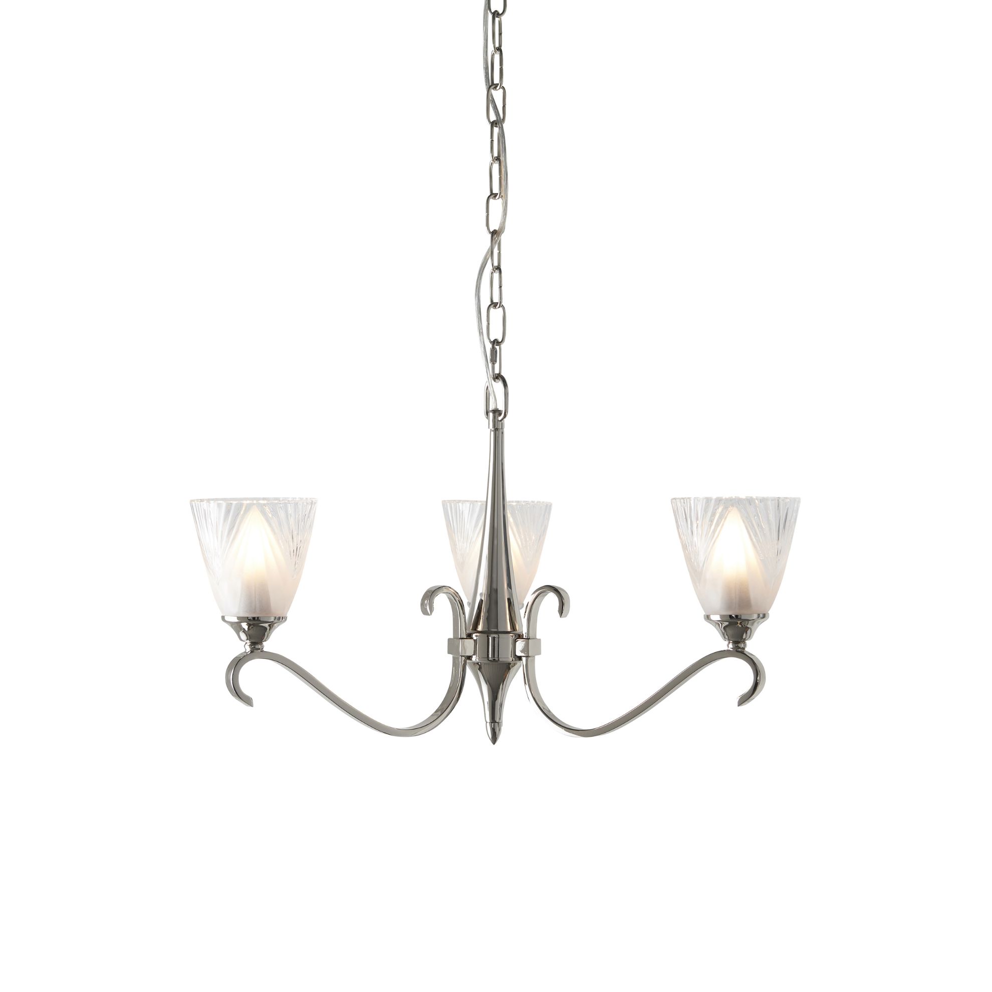 Exclusive 3 light pendant hung from a decorative chain and finished in polished nickel, complemented by beautiful art deco style glass shades.