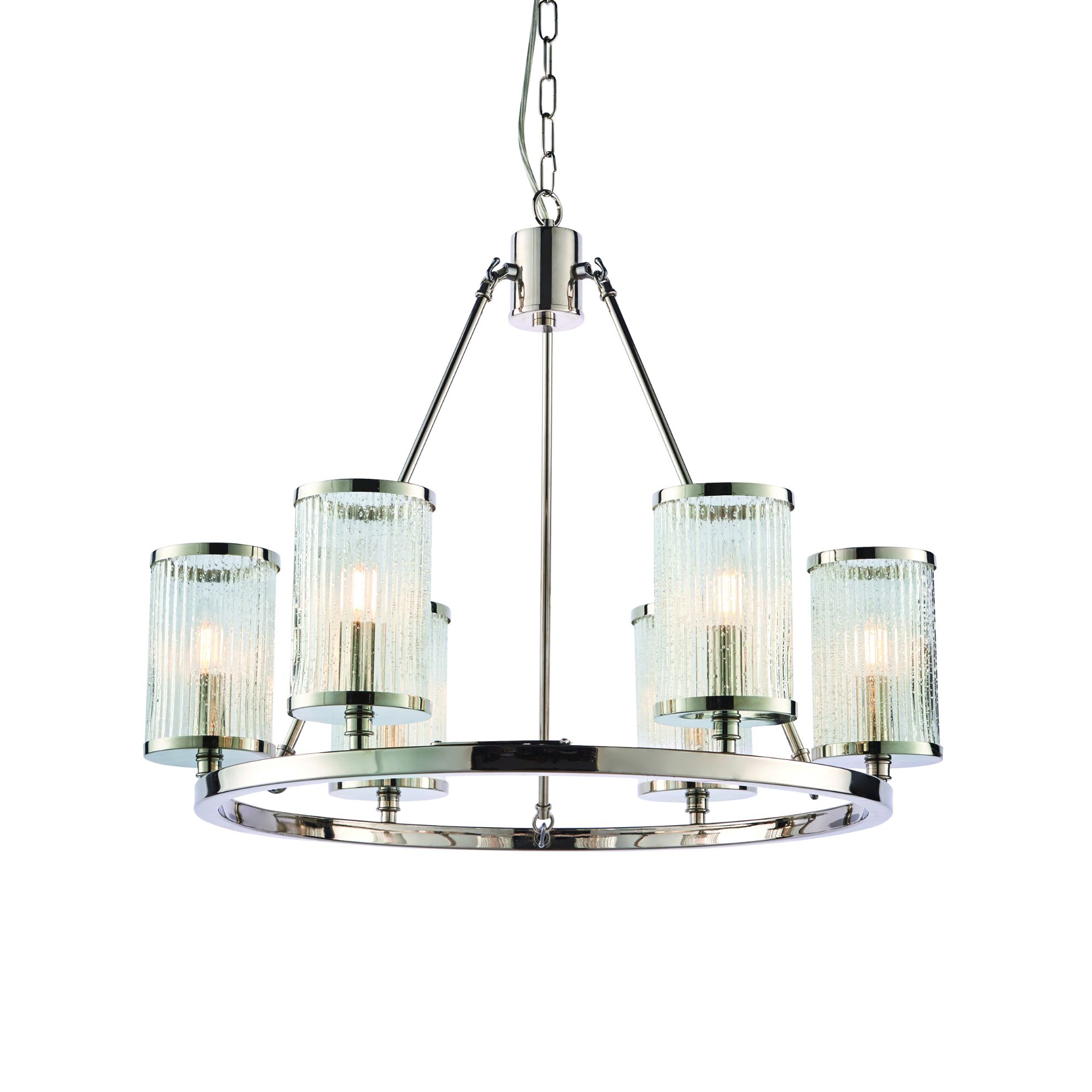 A unique classic styled chandelier in bright nickel plated finish. Inspired by hurricane lamps, the clear ribbed glass shades with bubble details create a perfect diffused light when lit by filament LED lamps. Each shade rests subtly on the rectangular section hoop and is suspended by three fixed arms with a height adjustable chain & clear flex set.