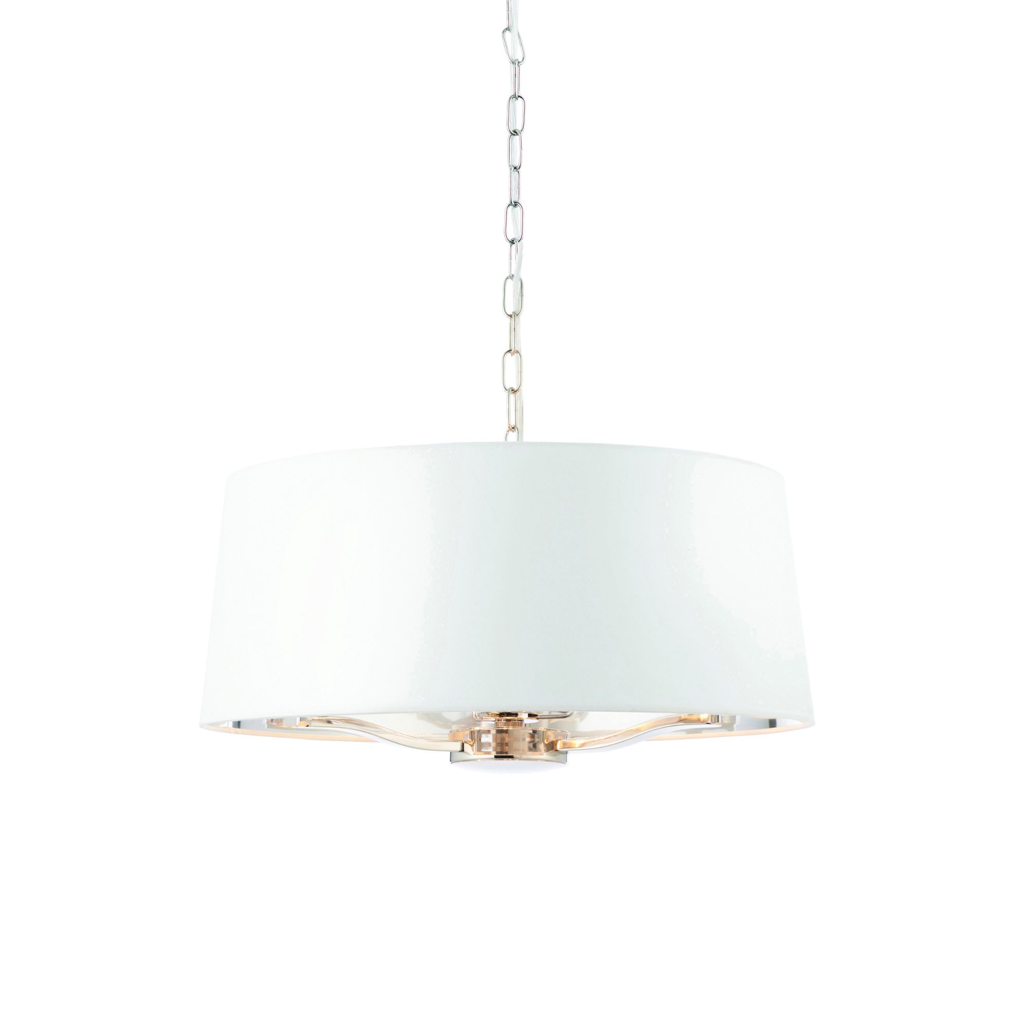 The Harvey 3 light pendant is finished in bright nickel plate and complemented by a vintage white, faux silk shade with metallic silver inner, for the perfect sophisticated boutique hotel look.
