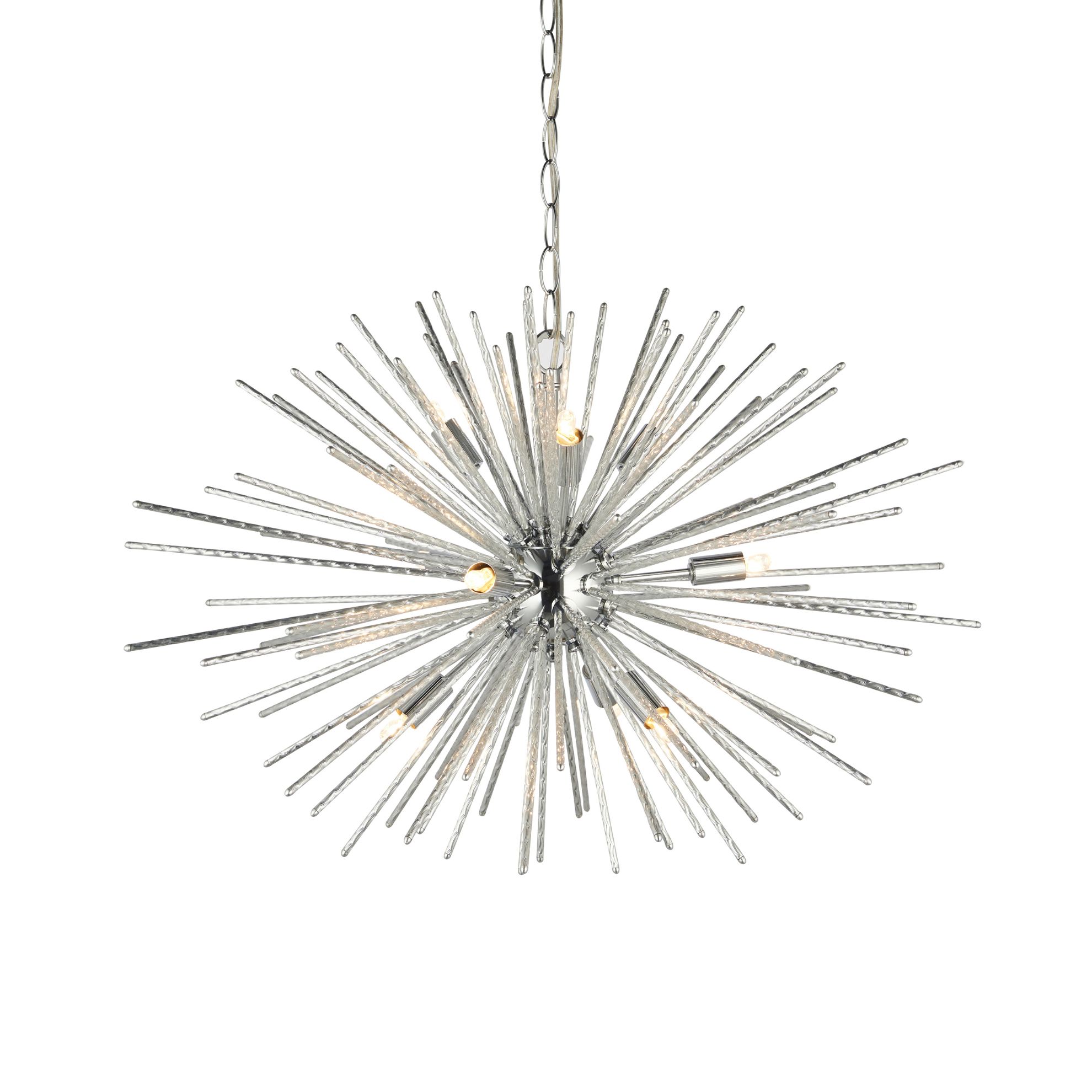 A modern version of a timeless classic from the past, finished in polished chrome featuring an 'explosion' of textured rods that create dramatic light patterns. Suspended from a height adjustable chain with clear flex, be brave and add this to modern or classic interiors to achieve that 'WOW' look...