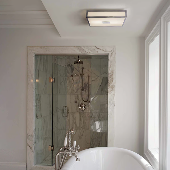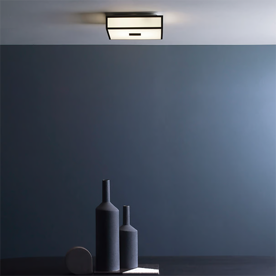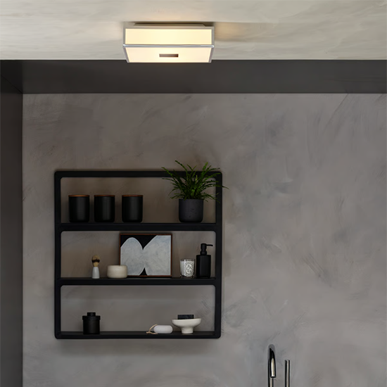 Enhance your bathroom with the Astro Mashiko Classic 300 Square Ceiling Light. Its sleek polished chrome frame and opal glass diffuser provide soft, even illumination, perfect for modern bathroom interiors.
