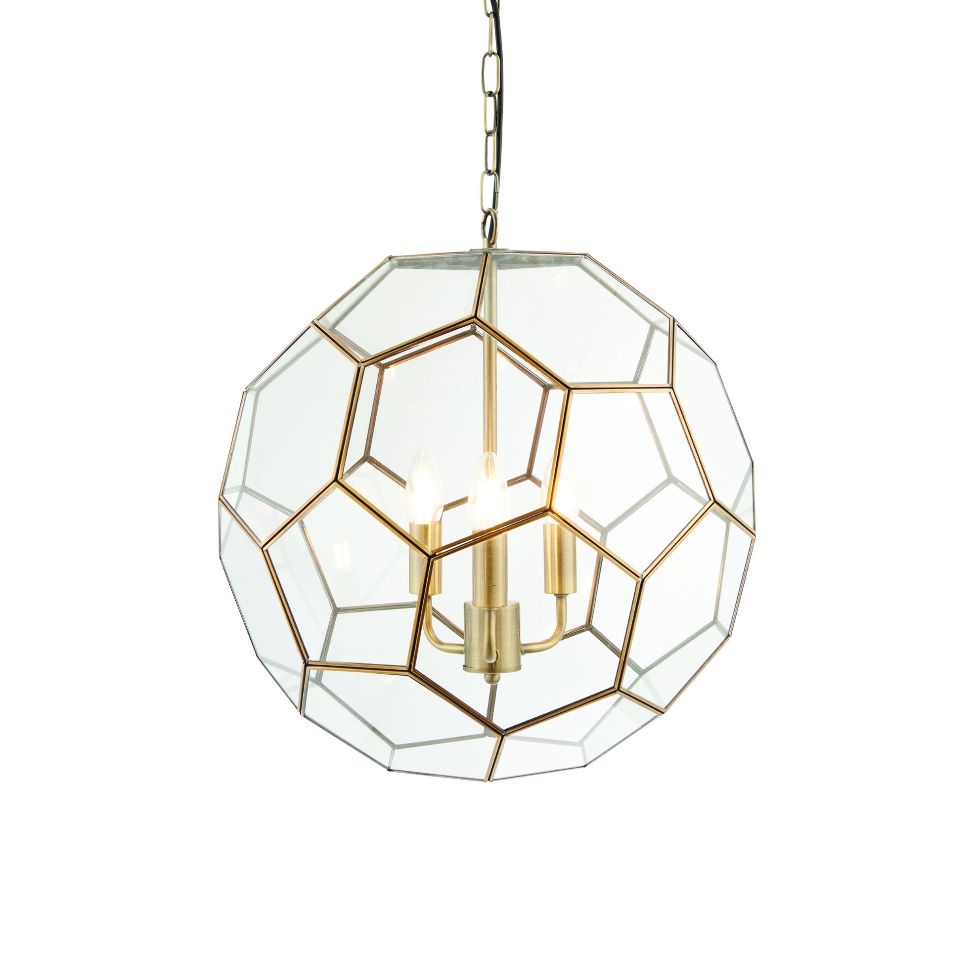 The Miele 3 light pendant has a striking design, incorporating hexagonal glass panels edged in antique brass. Suspended from a decorative chain.