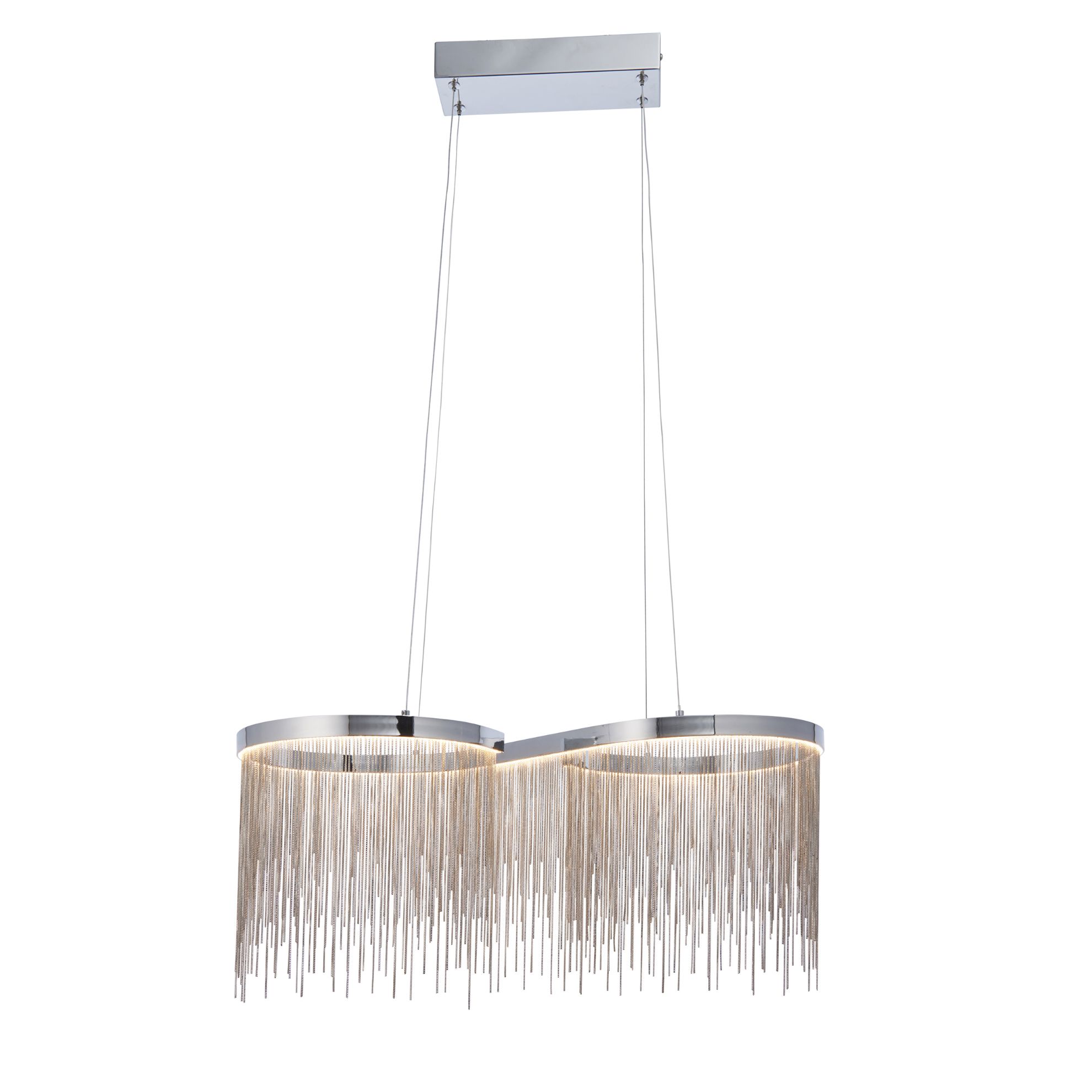 Stunning waterfall of fine chains form in a figure of eight pendant. Polished Chrome finish with silver effect chain create a diffused light effect. Height adjustable with a clear flex this decadent pendant is the ultimate statement piece suitable for dinner, living and bedrooms alike.