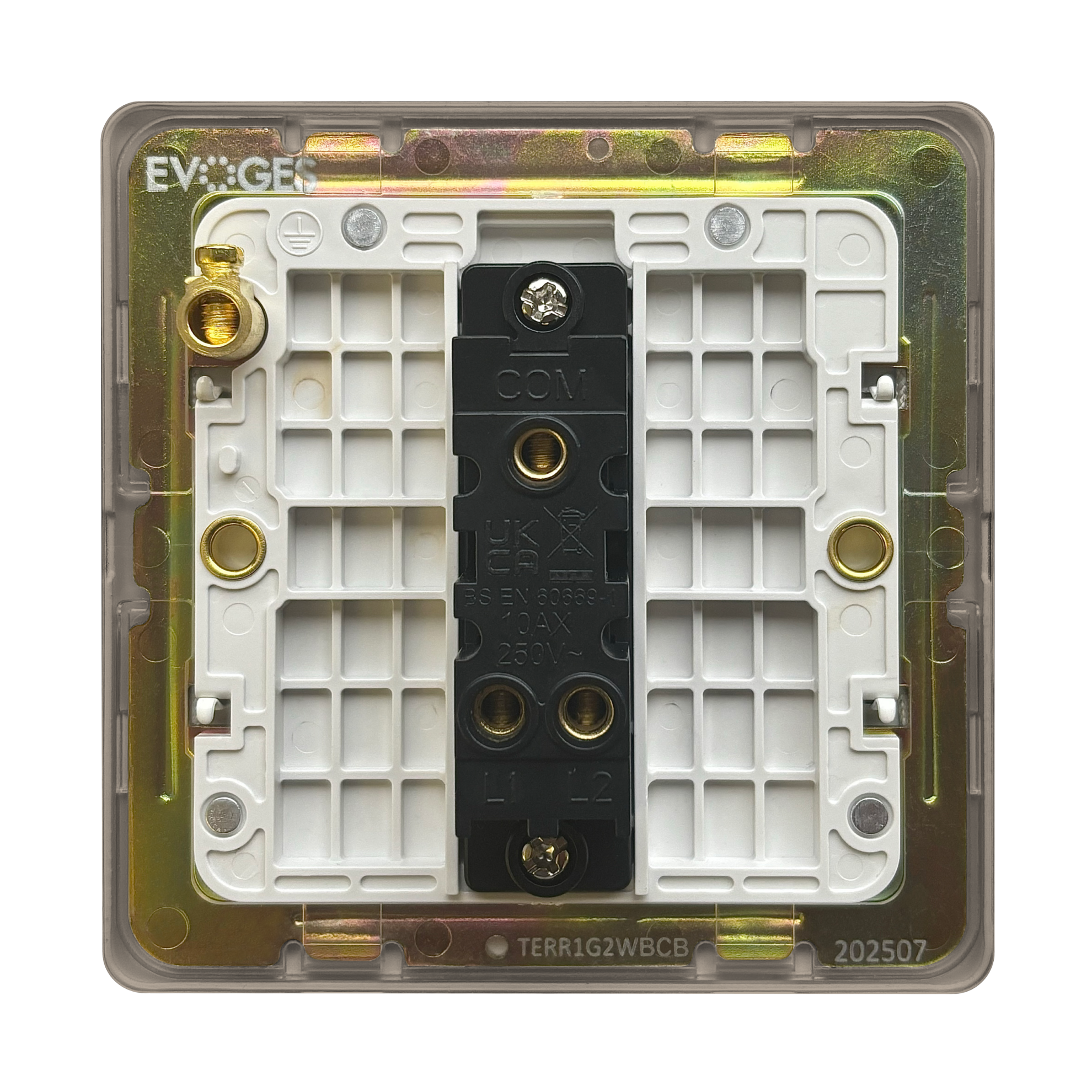 The EVOGES Terra Brushed Chrome Switch with Black Insert delivers a perfect balance of modern styling and reliable performance. Featuring a sleek brushed chrome plate paired with a contrasting black rocker, this switch adds a bold, contemporary touch to any interior while maintaining a clean and professional finish.
