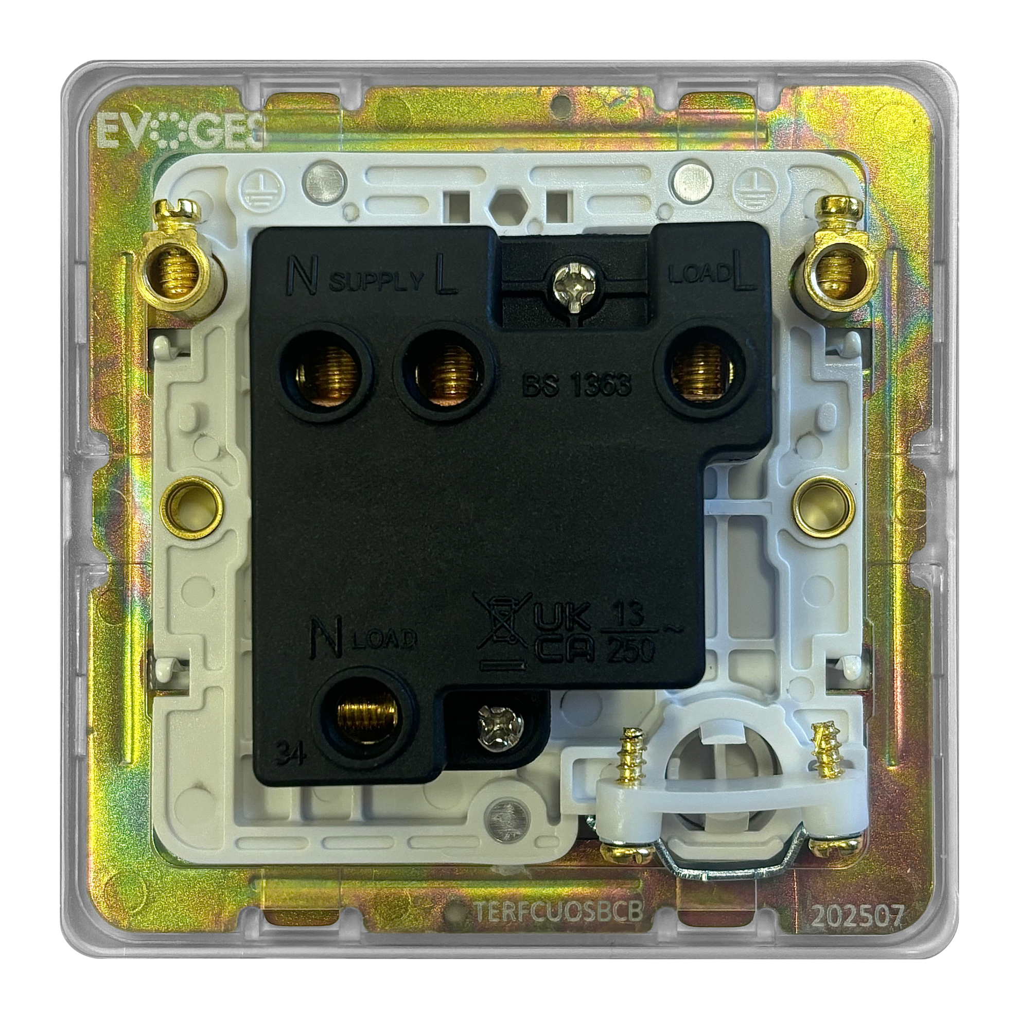 Featuring a sleek brushed chrome finish with a contrasting black insert, it delivers a clean, contemporary look that integrates seamlessly with the wider EVOGES Terra range. The integrated switched fused spur provides safe isolation and protection, while the front flex outlet allows for neat and convenient cable management. Built for reliability, it is suitable for residential and light commercial applications where both performance and appearance matter.