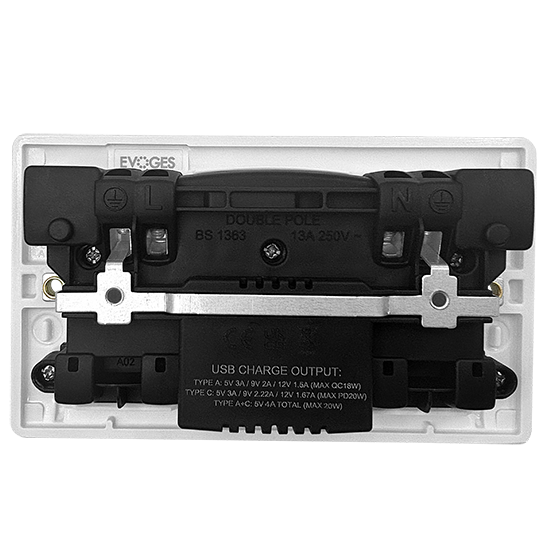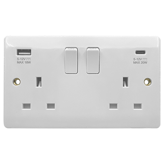 Vector 13A 2 Gang Double Pole Switched Socket with USB 45W Type A + C - White