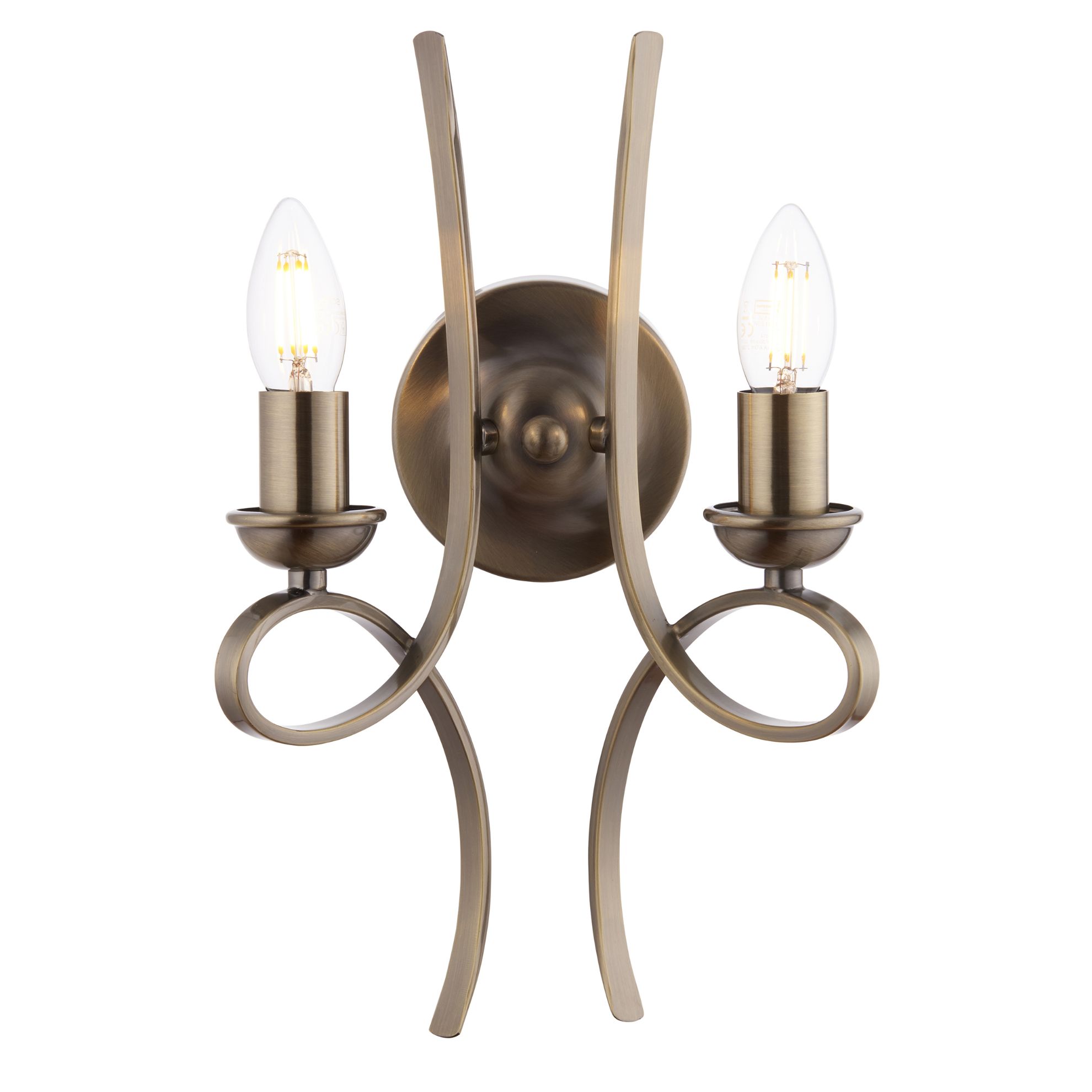 The Penn is a decorative range featuring sweeping, curved arms. This twin wall light is finished in a brushed brass effect plate