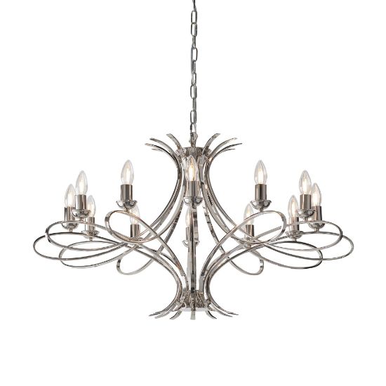 The Penn is an impressive 12-light pendant comprising of elegantly curved arms, finished in a nickel plate. Suitable for living areas, large hallways and reception rooms. A stunning centrepiece, especially when teamed with decorative filament candle lamps.