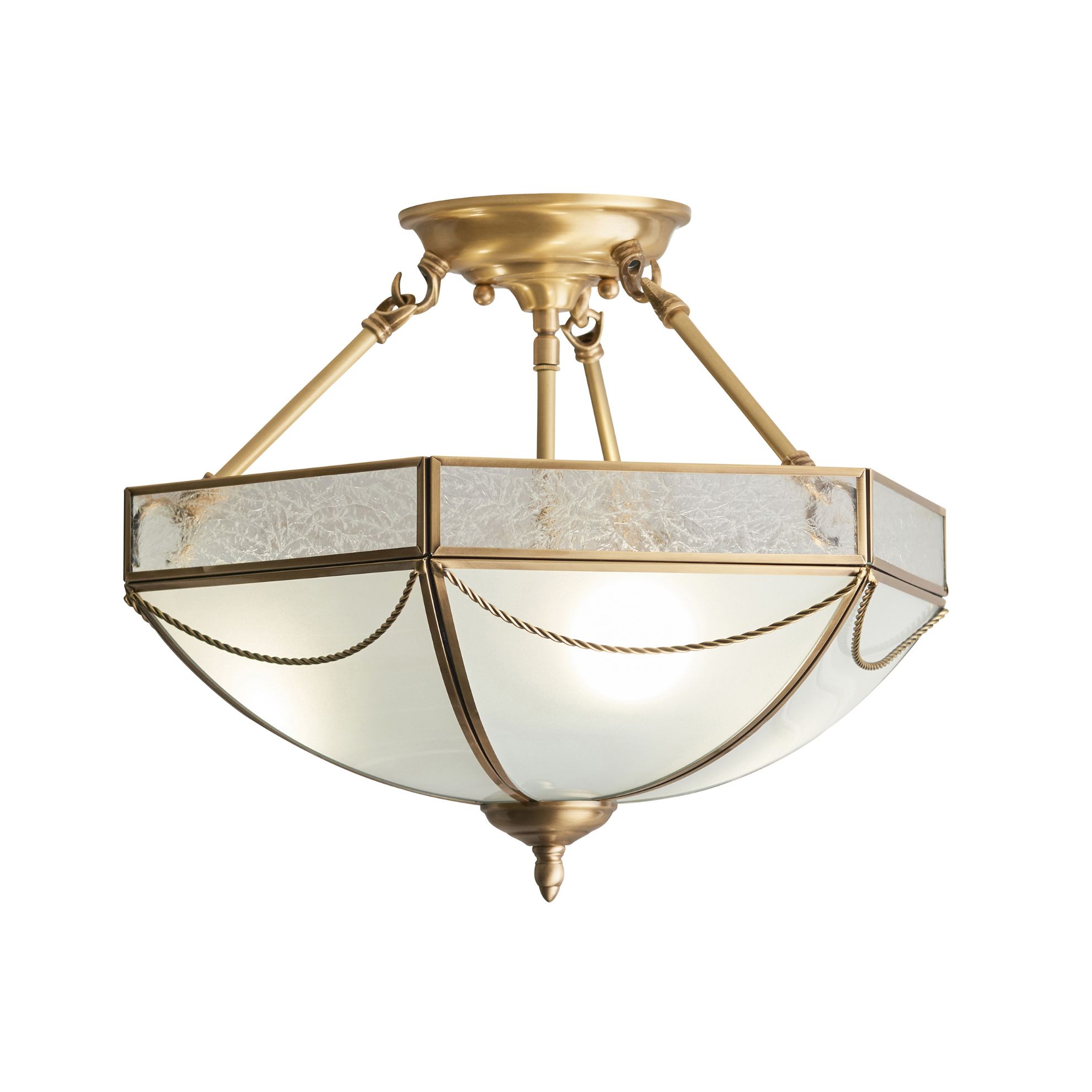 The Russell 3 light semi flush ceiling fitting has a traditional style and combines frosted glass and a solid brass trim.