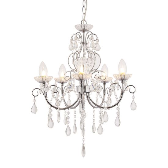 The Tabitha 5 light semi flush ceiling fitting is finished in a chrome effect plate with clear crystal glass detail and droplets. IP44 rated so suitable for use in the bathroom, dimmable and suitable for use with LED lamps.