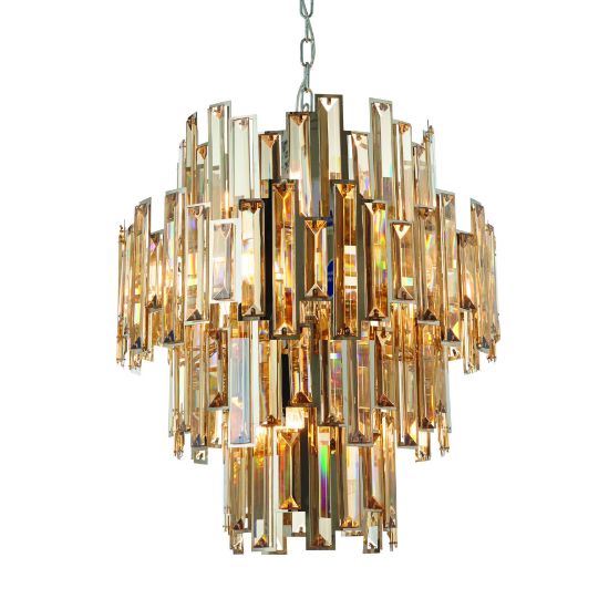 A luxuriant mix of tinted champagne coloured bevelled crystals and polished chrome finish. Lavish in style and impressive in scale, to create the perfect hotel Luxe look. Twin with LED filament lamps for a stunning interior centrepiece.